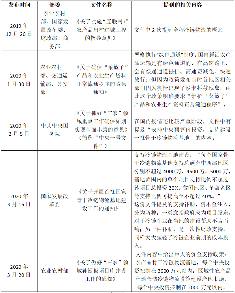 表3 近期发布的有关冷链行业的相关政策